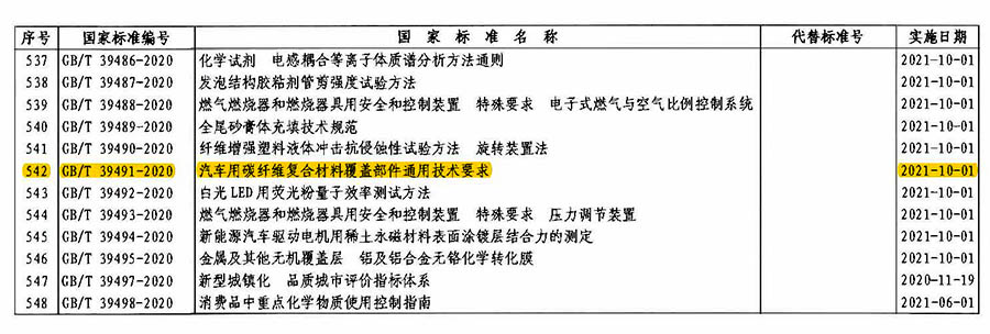 近日,好博在线牵头主导制定的国家标准GB/T39491-2020《汽车用碳纤维复合材料覆盖部件通用技术要求》由国家市场监督管理总局批准发布,标准将于2021年10月1日开始实施。