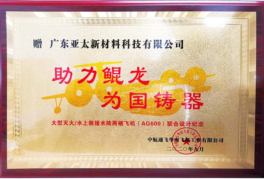中航通飞华南飞机工业公司是专业从事通用飞机和特种飞机研制生产的飞机主制造商。中航通飞研究院有限公司总设计研发的AG600型水陆两栖飞机,是国家重点支持开发项目,4月6日,广东亚太公司与中航通飞研究院有限公司就AG600飞机研发改进项目合作正式启动,亚太公司先后派出55位科研人员参与该项目的设计与研发,全力以赴完成了担负的各项任务。7月26日,AG600型水陆两栖飞机在山东青岛海上试飞成功。9月25日,中航通飞华南飞机工业公司给广东亚太公司送来感谢信,信中表示“贵公司克服疫情带来的不利影响,在自身任务繁重,人手较少的情况下,派出精兵强将参与AG600结构、强度专业的改进设计作业,紧跟研制进度,加班加点,出色地完成了所承担的任务,在此深表感谢!”