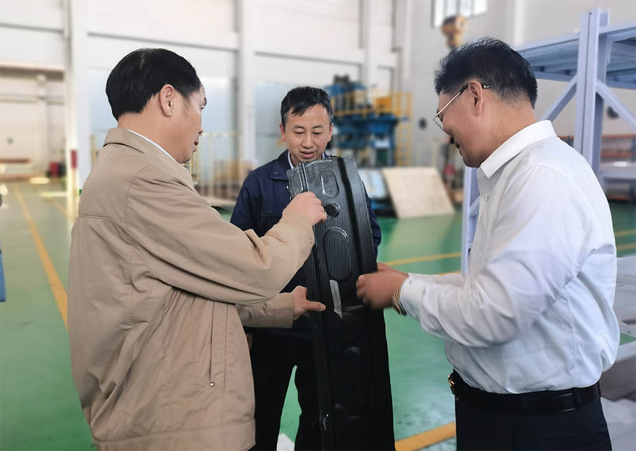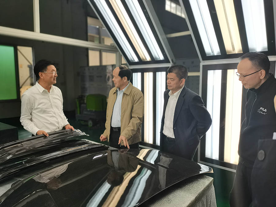 梁祥达主任深入金属事业部汽车雨刮支条车间、复合材料部件成型车间调研企业运行情况,并兴趣浓厚参观展厅高性能复合材料汽车零部件,不时向董事长朱增余询问产品重量、结构、性能、市场等情况,董事长用专业知识、可靠的数据依依做了回答。