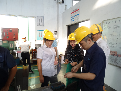 图:翟秀凤副总(左一)陪同汤家欢副市长(左二)在汽车雨刮车间参观。