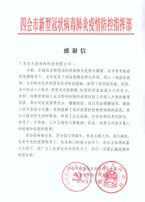 广东亚太公司捐款10万元支助四会市 中医院抗击新冠肺炎疫情阅读次数:879 | 发布日期:2020/2/27 | 作者: | 来源: